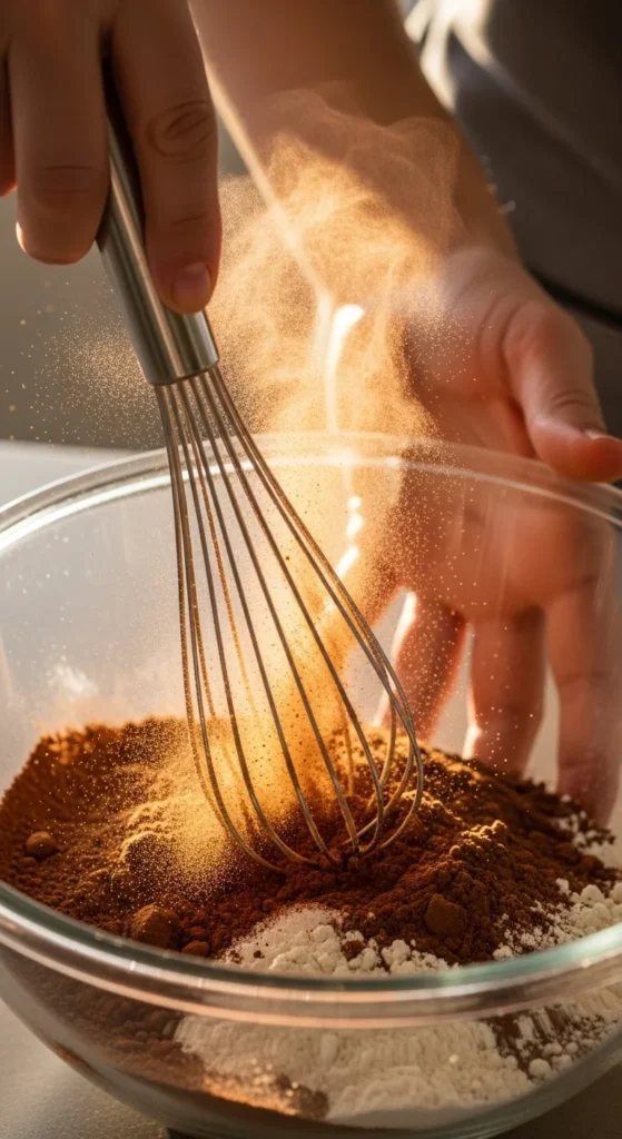 This ensures an even distribution of cocoa and prevents lumps. Set it aside — it’ll be your base for that tender crumb.