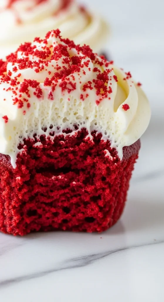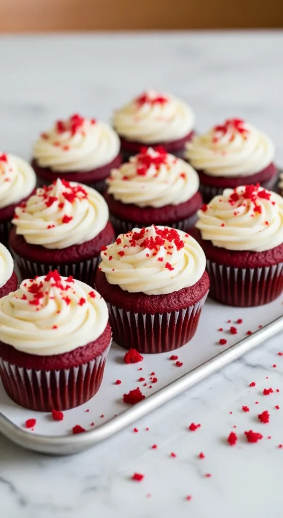 Pipe or spread the frosting generously over each cooled cupcake. For a pro finish, sprinkle a few red crumbs on top!