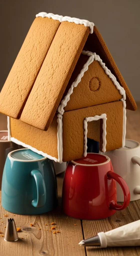 - Start with the walls: Pipe icing along the edges and press the walls together gently. Use cans or mugs to hold them in place as they dry.