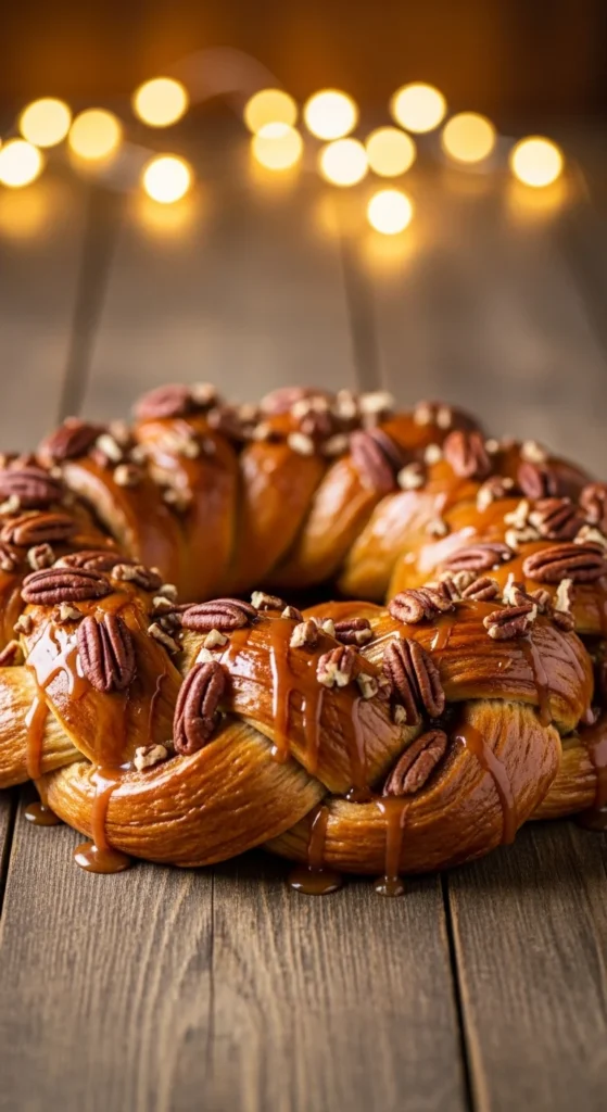- Roll dough; drizzle caramel and sprinkle pecans. Shape into wreath; rise 30 minutes. Preheat oven 350°F (175°C).