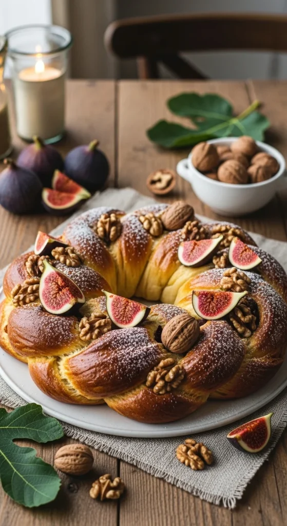 - Fold in figs and walnuts; shape wreath. Rise 30 minutes. Preheat oven 350°F (175°C). Brush with butter.