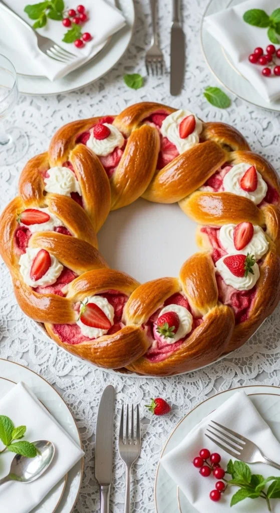 - Spread cream cheese and strawberry jam on rolled dough; shape wreath. Rise 30 minutes. Preheat oven 350°F (175°C). Brush with butter.