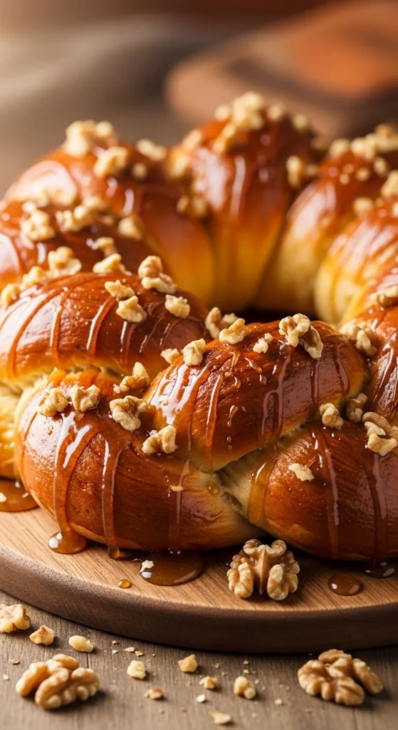 - Roll dough; drizzle maple syrup and sprinkle walnuts. Shape into wreath; rise 30 minutes. Preheat oven 350°F (175°C). Brush with butter.
