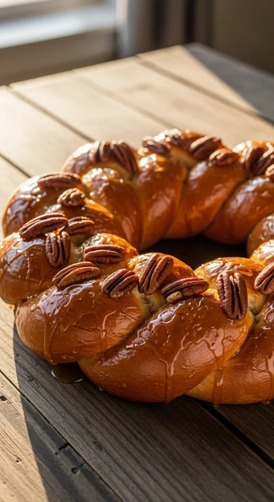- Roll dough; spread maple syrup and sprinkle pecans. Shape into wreath; let rise 30 minutes.