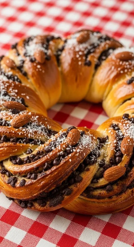 - Fold in chocolate, almonds, and coconut. Shape wreath; rise 30 minutes. Preheat oven 350°F (175°C).