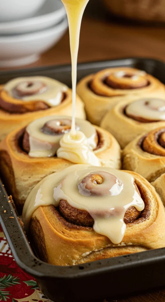 Soft rolls swirled with cinnamon sugar and topped with creamy eggnog icing make mornings magical. Use store-bought dough to save time. The glaze is just powdered sugar mixed with eggnog—simple and delicious. These are guaranteed crowd-pleasers.