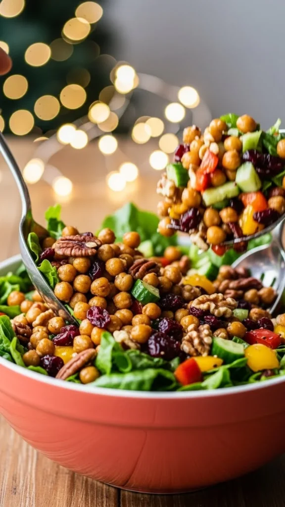 A great salad starts with fresh, vibrant ingredients. Chickpeas bring heartiness, while crisp vegetables and crunchy add-ins make it feel like a Christmas party in every bite.