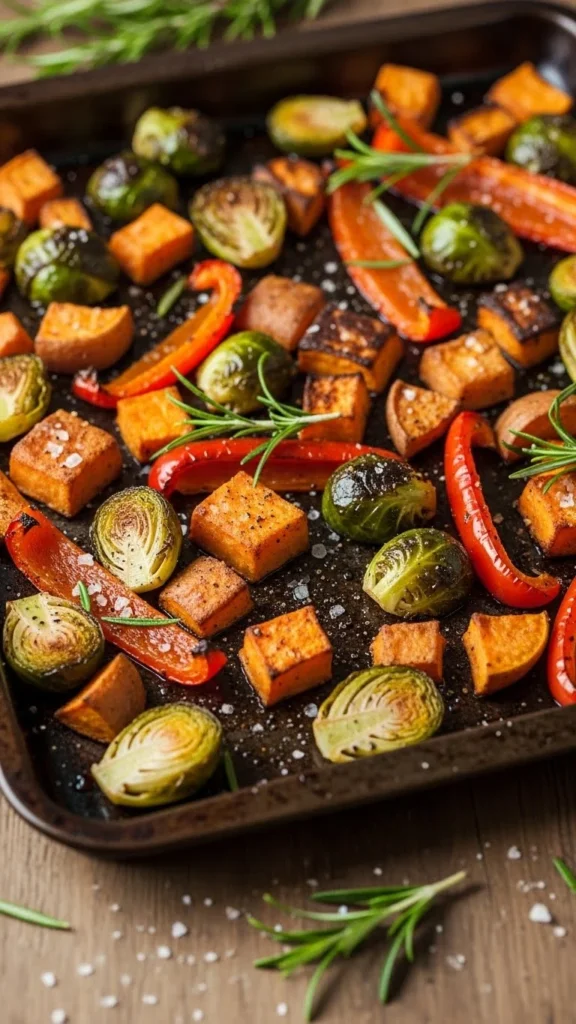 - Vegetables: Roasted sweet potatoes, Brussels sprouts, and red bell peppers