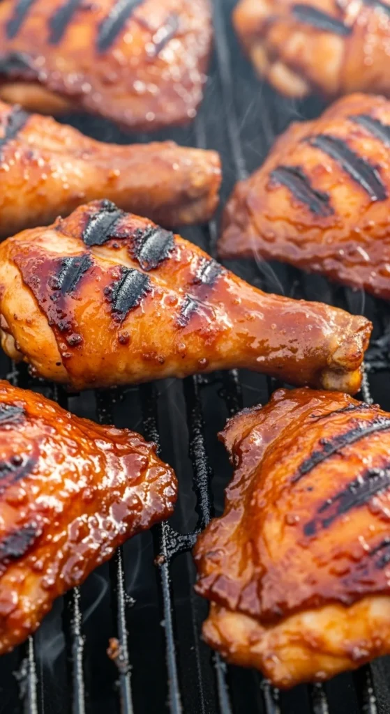 Place the chicken on the grill, skin side down first. Cook for 5–7 minutes per side until golden brown. During the last 5 minutes of cooking, brush the chicken generously with BBQ sauce mixed with honey or maple syrup. Close the lid to let the sauce caramelize slightly.