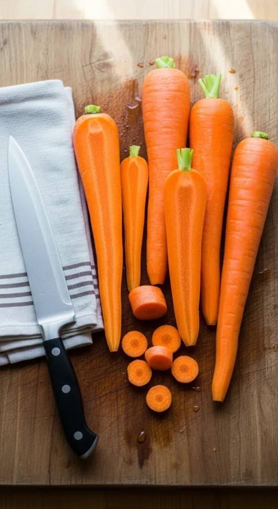 Start by washing and peeling your carrots. If they’re large, slice them in half lengthwise so they cook evenly. Keep smaller carrots whole for a more rustic Christmas look.