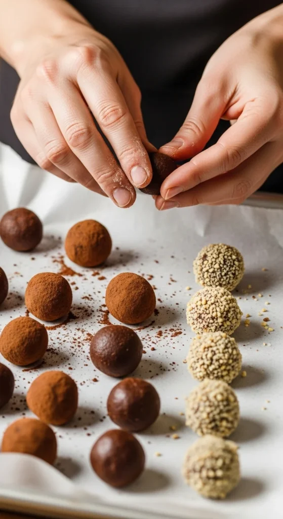 💡 Tip: If your hands get sticky, dust them lightly with cocoa powder or chill the ganache for a few more minutes.