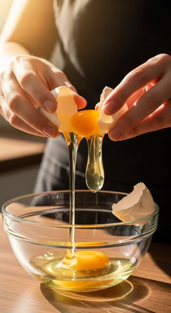 Crack the eggs carefully — even a drop of yolk can ruin your meringue’s texture. It’s easiest to separate them while cold, but let the whites come to room temperature before whisking. Warmer whites whip up more easily and reach higher volume.