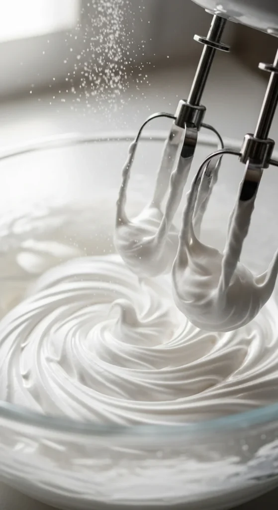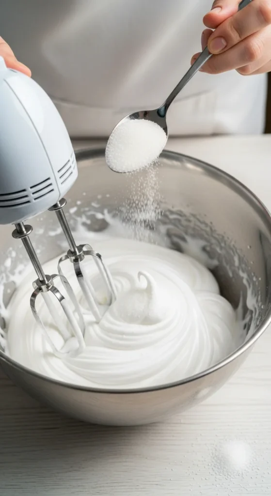 Turn your mixer to high speed and add sugar one tablespoon at a time, allowing it to dissolve before adding more. This process should take about 5–7 minutes. You’ll know it’s ready when the mixture becomes thick, shiny, and forms stiff peaks that hold their shape.
