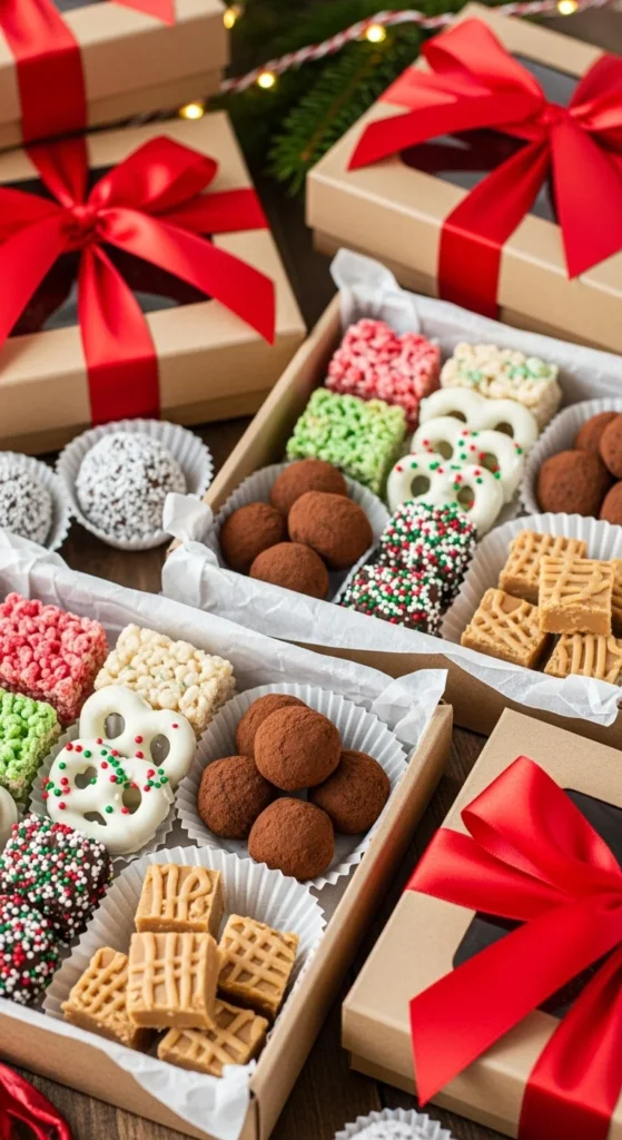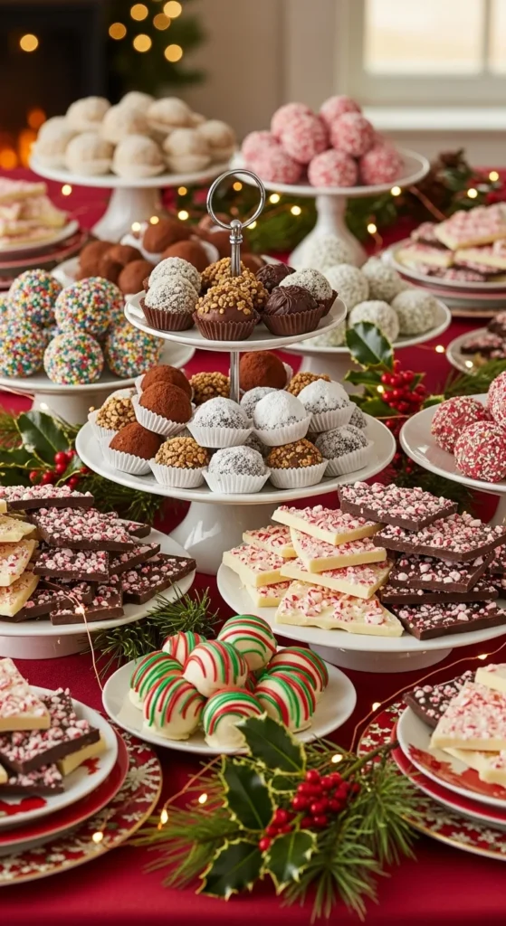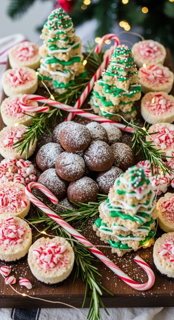 Turn your no-bake creations into a show-stopping centerpiece! Arrange your peppermint bark, truffles, and cookie dough bites on a wooden board with festive flair.
