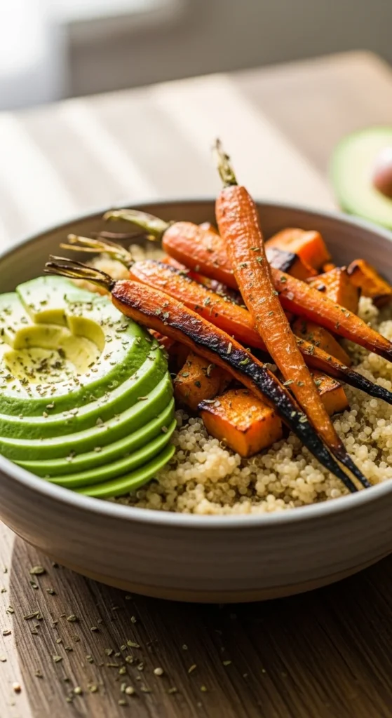 2. Assemble bowl with grains and roasted veggies; top with avocado.
