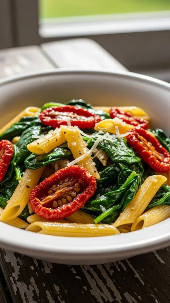 - Toss pasta with spinach and season with salt, pepper, and Parmesan.