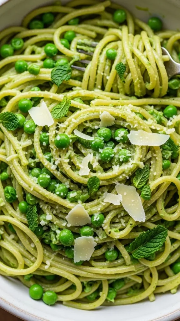 The sweetness of peas pairs perfectly with aromatic mint for a refreshing pasta dish.