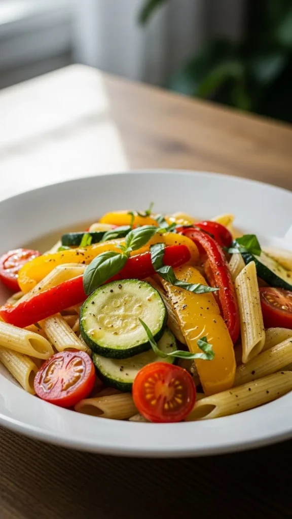 Loaded with crisp seasonal vegetables, this penne is both colorful and satisfying.