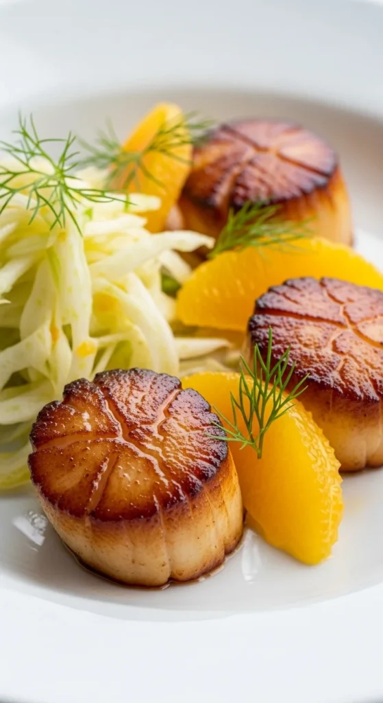 Sweet scallops paired with crisp fennel and citrus create a fresh seasonal plate.