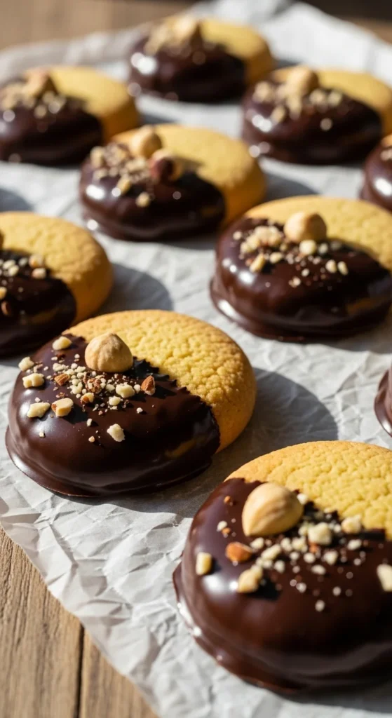 - Dip half of each cookie into the chocolate.