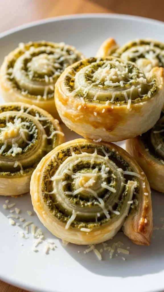 - Spread pesto over puff pastry, sprinkle Parmesan.