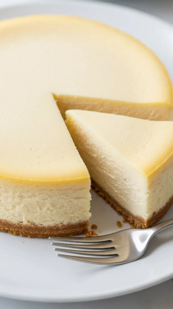 A rich, dense cheesecake with a smooth finish that pairs well with fruit or chocolate toppings.