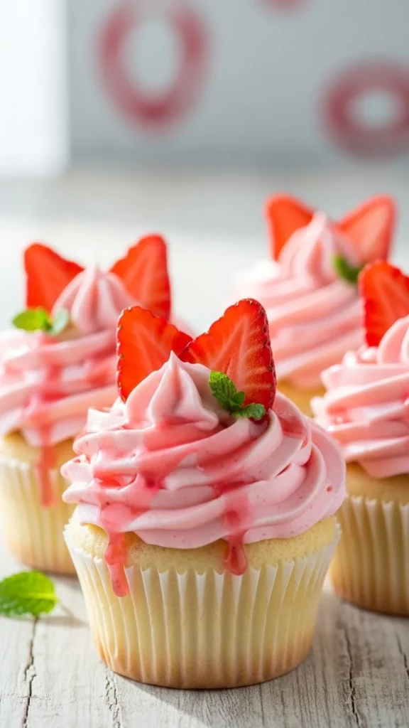 These cupcakes are a Valentine favorite with their light vanilla base and fresh strawberry flavor.