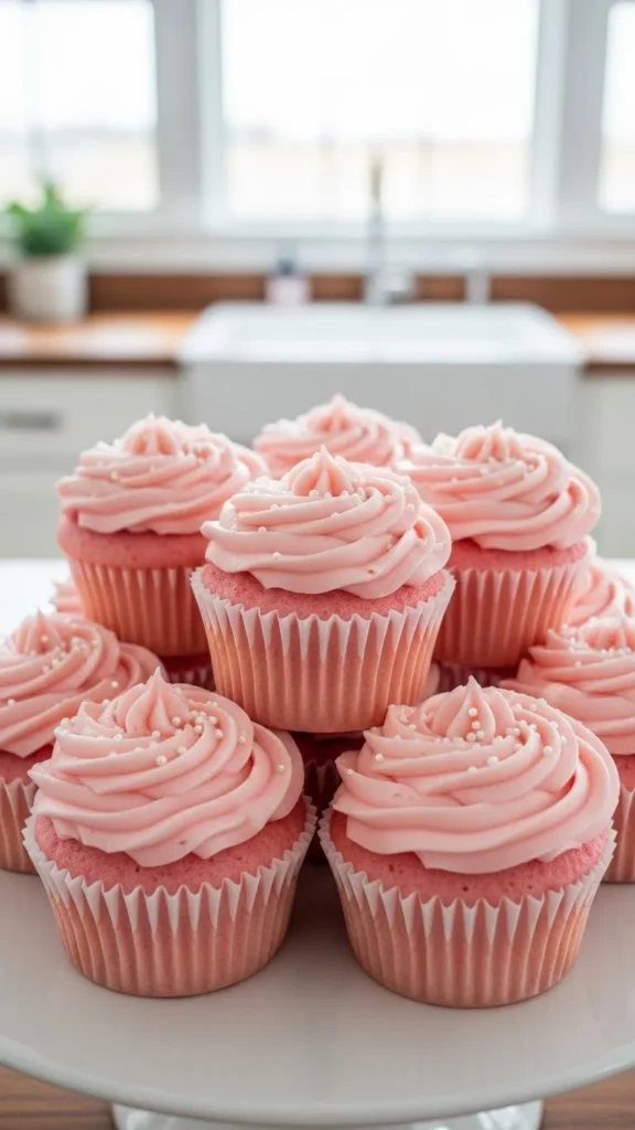 These cupcakes offer a milder flavor than red velvet with a soft blush tone.
