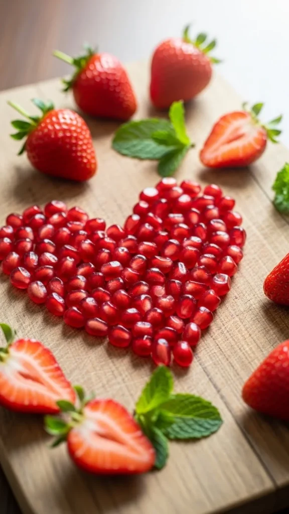 1. Arrange strawberries around a heart-shaped outline of pomegranate seeds.