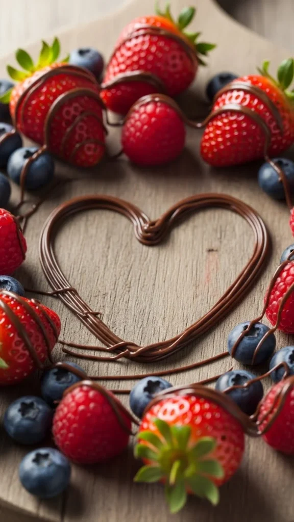 Chocolate and berries combined into a heart shape create a festive, romantic board.