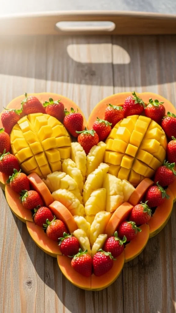 1. Arrange mango, pineapple, and papaya in a heart shape.