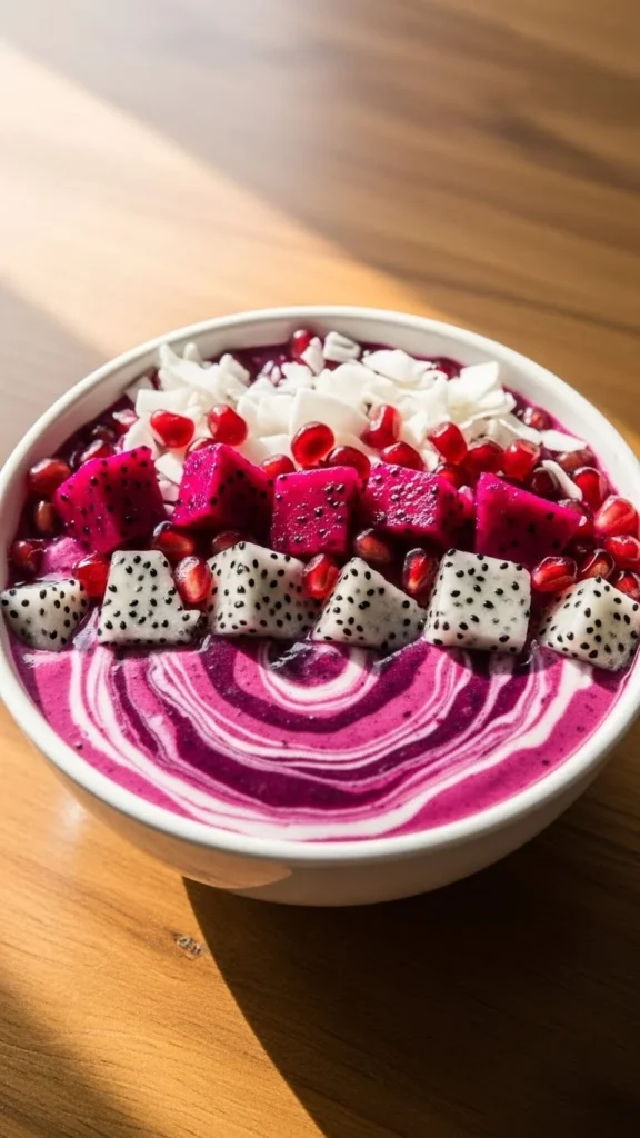 - Toppings: pomegranate seeds, dragonfruit chunks, coconut flakes