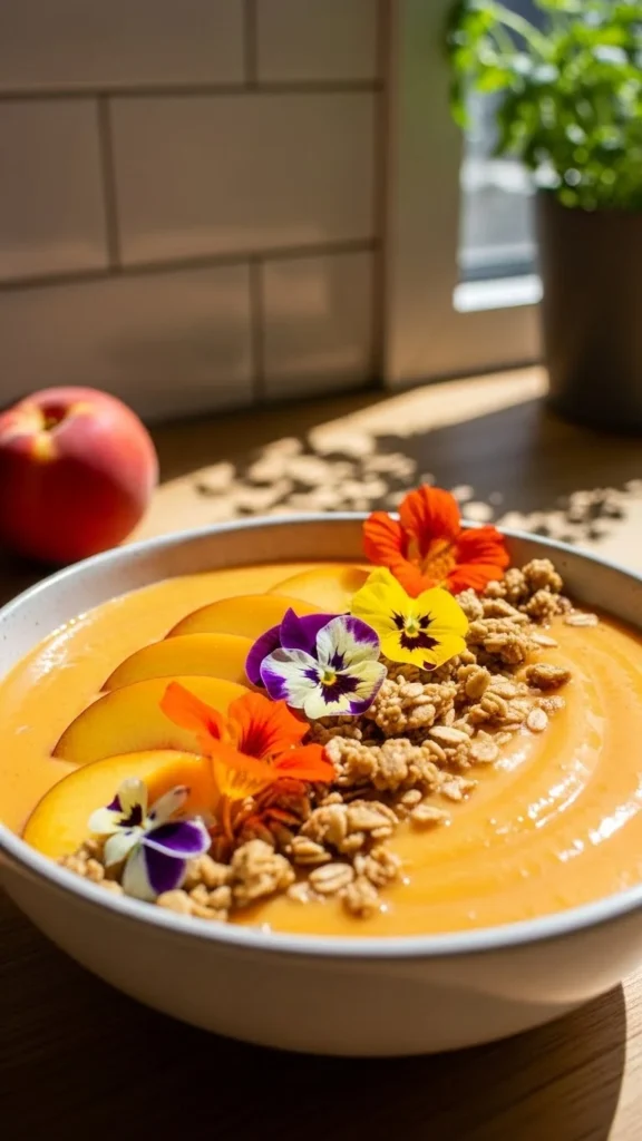 - Toppings: peach slices, granola, edible flowers