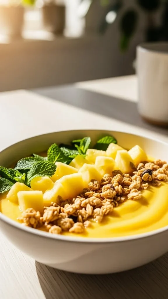 - Toppings: pineapple cubes, fresh mint leaves, granola