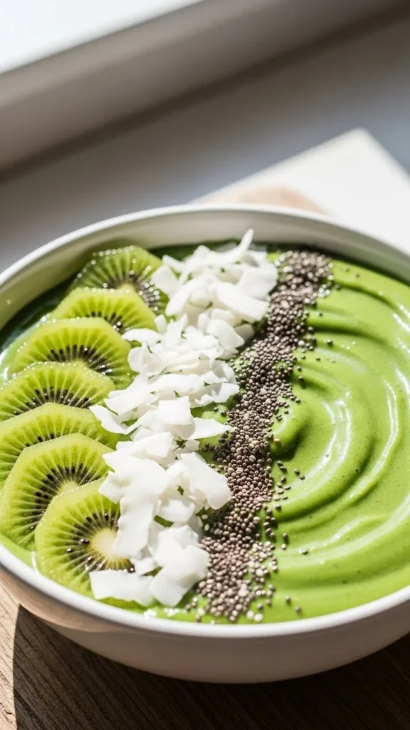 - Toppings: kiwi slices, coconut flakes, chia seeds
