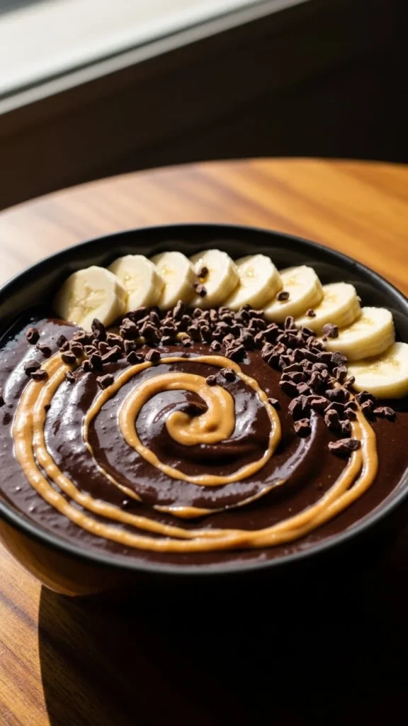 - Toppings: banana slices, cacao nibs, peanut butter drizzle