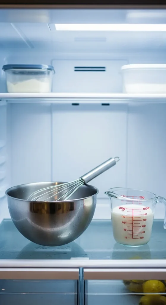 - Chill your mixing bowl and beaters in the fridge or freezer for about 15 minutes.