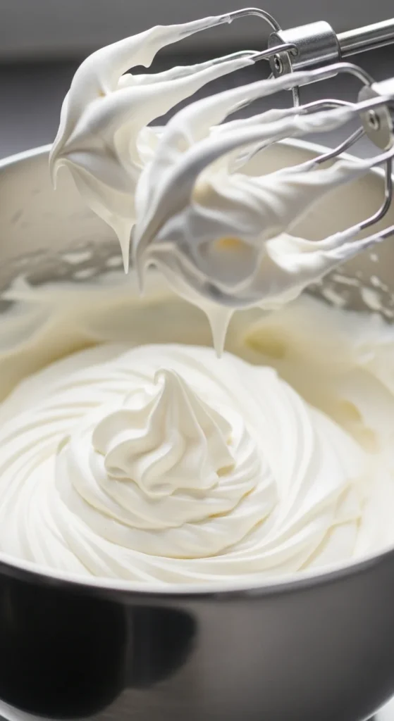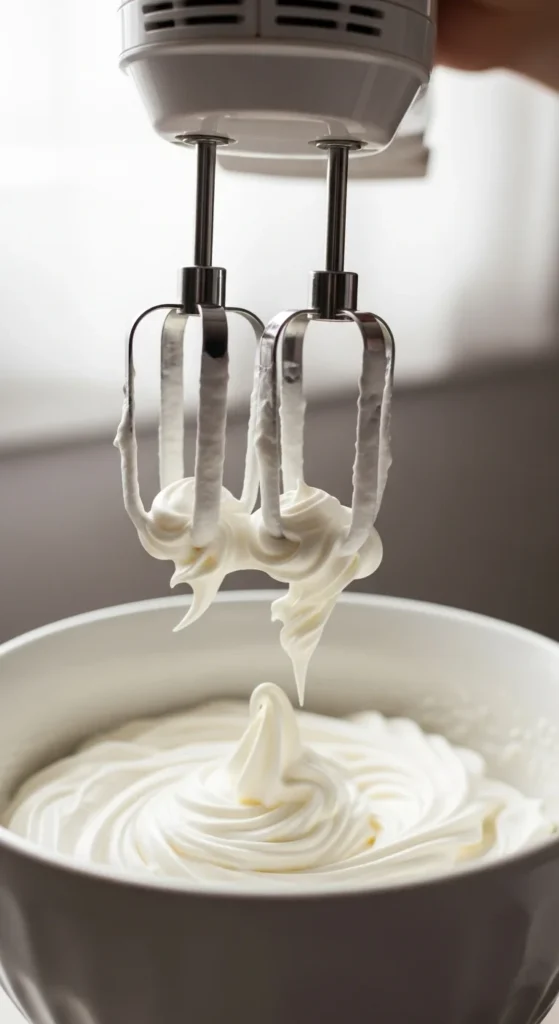 As you continue mixing, you’ll reach the soft peaks stage — when the cream starts to hold its shape but gently folds over when you lift the whisk.